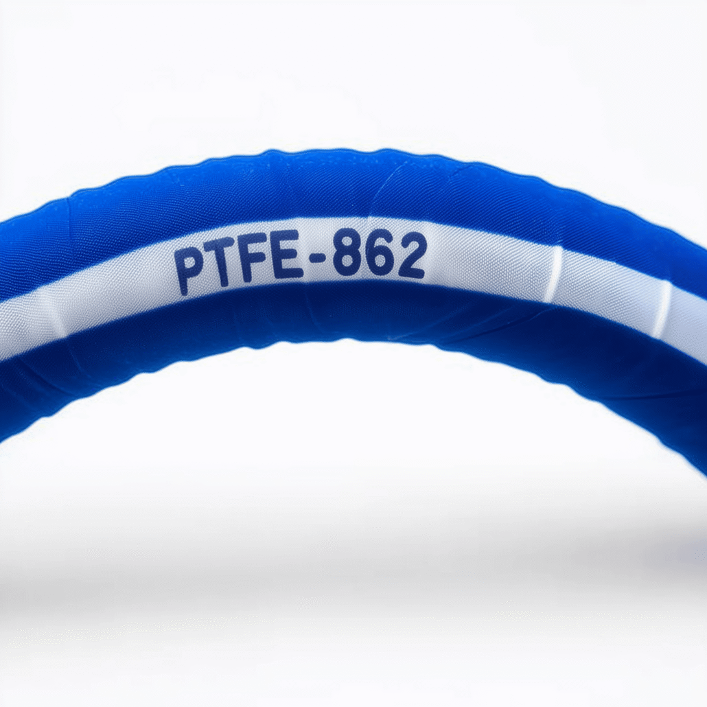 Die PTFE-862-Schläuche werden in der Chemie- und Lebensmittelindustrie eingesetzt und eignen sich hervorragend für den Transport unterschiedlichster Flüssigkeiten. Die Innenschicht besteht aus FDA-zugelassenem PTFE-Granulat (antistatische Ausführung auf Anfrage); die Außenschicht ist blauer EPDM-Gummi und bietet eine hohe Temperaturbeständigkeit.